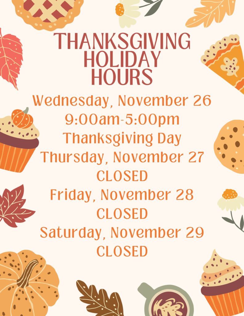 The Thanksgiving holiday is coming soon and the Library has special hours during that week. On Wednesday, November 26, the Library is open 9:00am to 5:00pm. The Library will be closed Thanksgiving Day, Thursday, November 27, through Sunday, November 30. The Library will open at 9:00am on Monday, December 1.