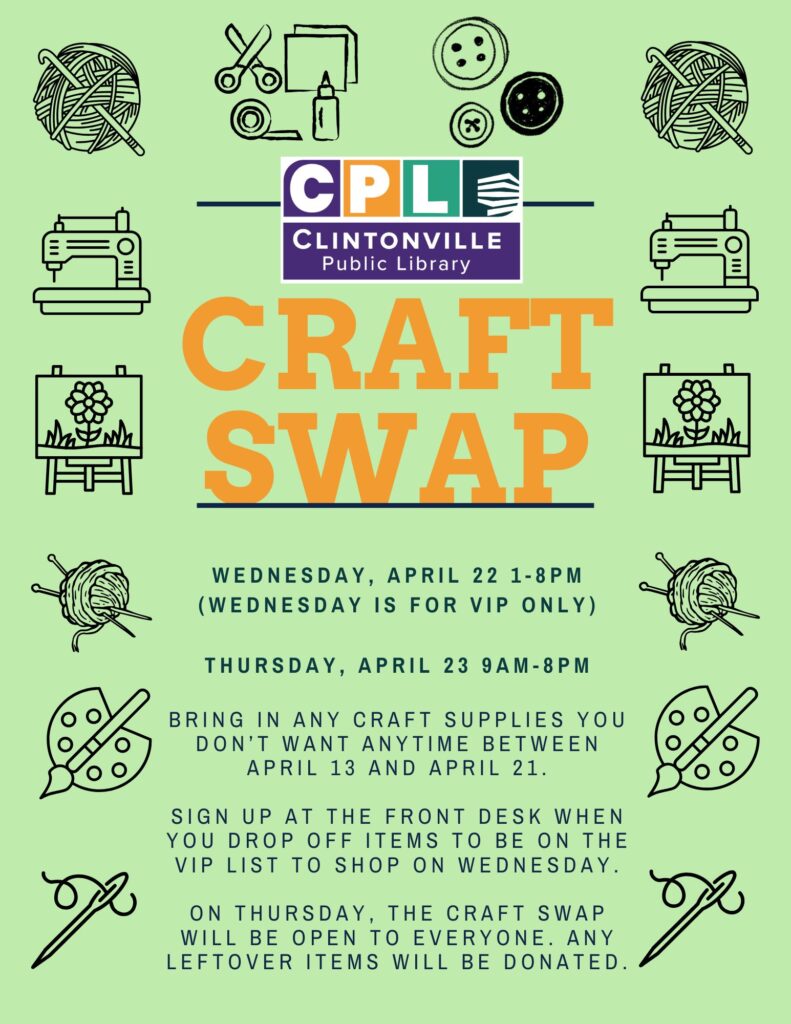 New or gently used craft supplies donations will be accepted at the library starting on Monday, April 13 through Tuesday, April 21 during normal library hours at the front Desk.