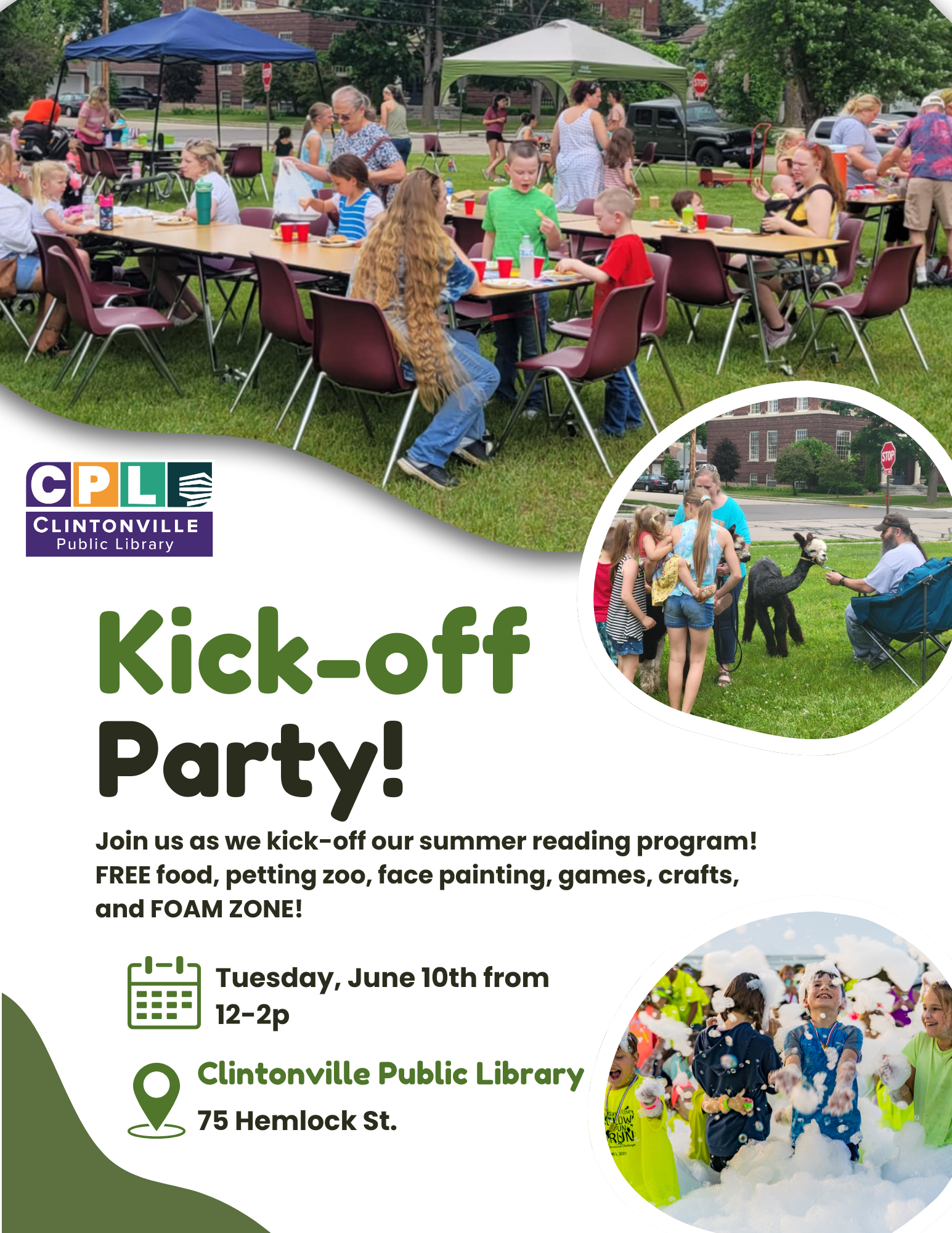Help us kick-off our summer reading program with a bang! We will have FREE food, games, crafts, sensory table, petting zoo, face painting, and the foam zone!! Get yourself and your kiddos signed up for summer reading after all the fun!