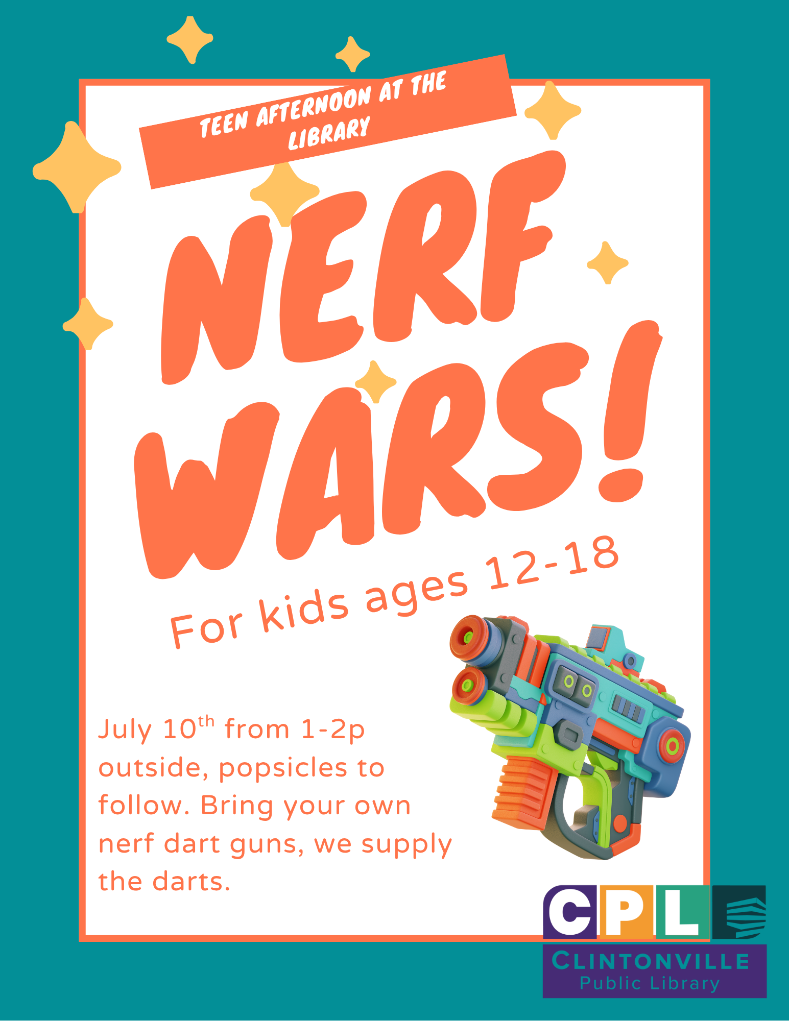 Teens ages 12-18 join us for our annual nerf war! This event will take place outside (weather permitting). Please bring your own nerf dart gun (we do have a few to lend out), and we will provide the darts. We will enjoy some popsicles after the battle!