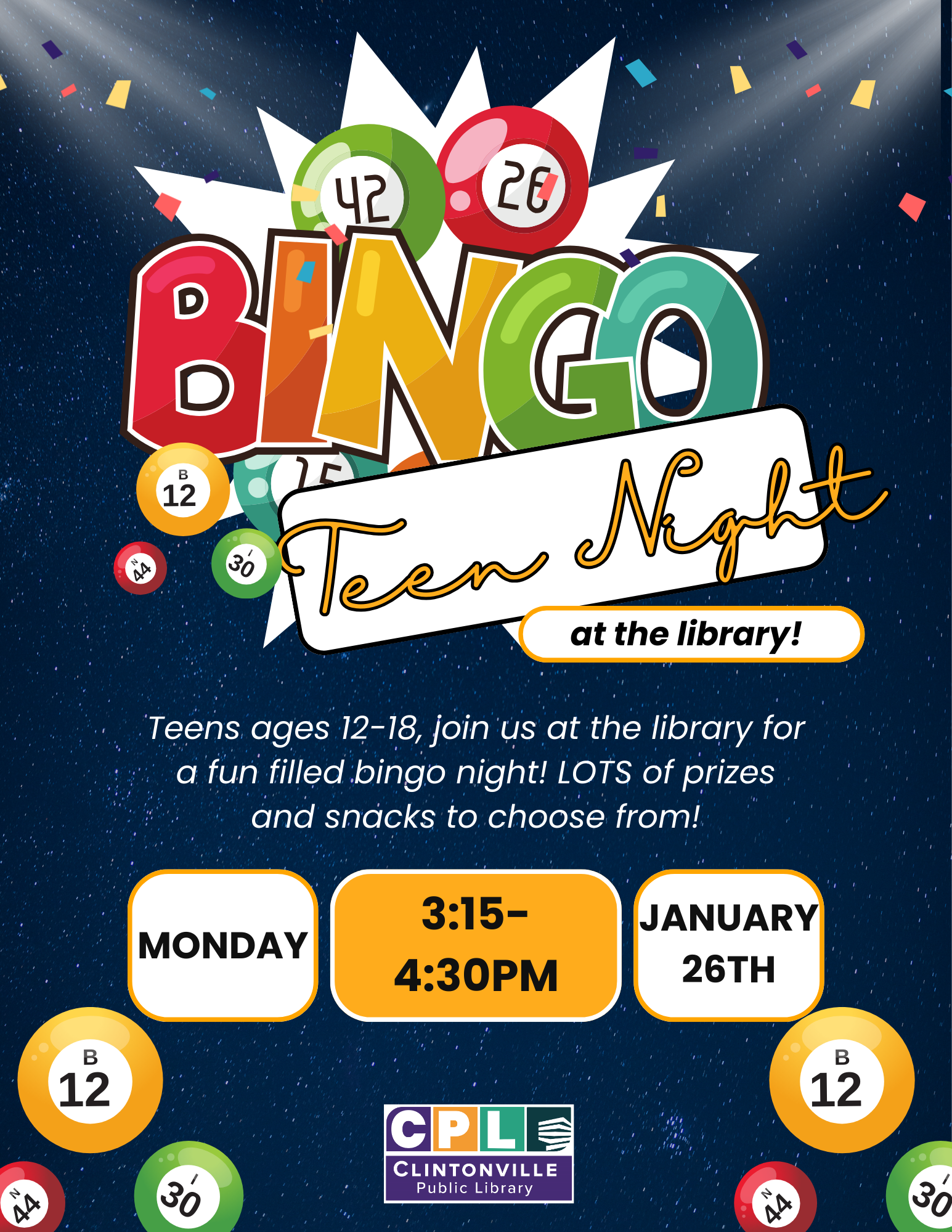 Teens ages 12-18, join us for a fun filled Bingo night! LOTS of fun prizes to choose from, and of course snacks will be provided.